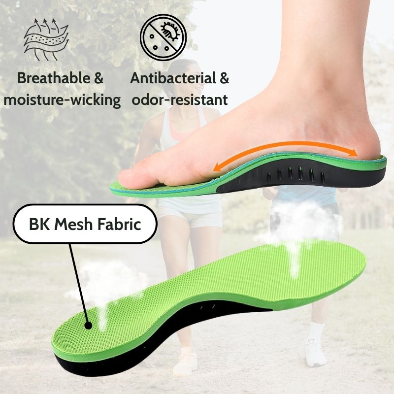 Enjoy freshness with the breathable BK mesh fabric, designed to wick away moisture and prevent odors. The soft velvet-touch top layer reduces friction, keeping your feet comfortable and dry through hours of wear. These materials make the insoles ideal for both sports and daily routines.